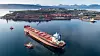 Aerial,Shot,Of,A,Cargo,Ship,Approaching,Port,Terminal,With