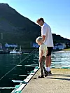 Vinterjakken jeg hadde på meg ble slengt inn i det lille rekkehuset som vi leier av kommunen, og vi dro rett på fisketur på kaia.
